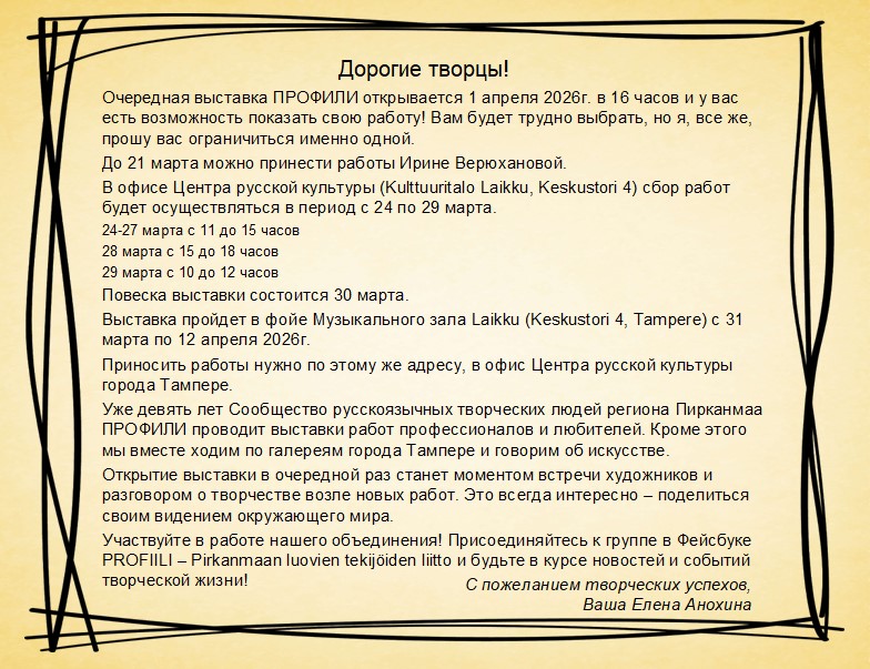 9 апреля, в субботу, в 14.00 вновь пройдет Тотальный диктант в очном формате! Встречаемся в Kulttuuritalo Laikku, в зале Syrja, на 4 этаже. Приглашаем всех любителей русского языка! Вход свободный!